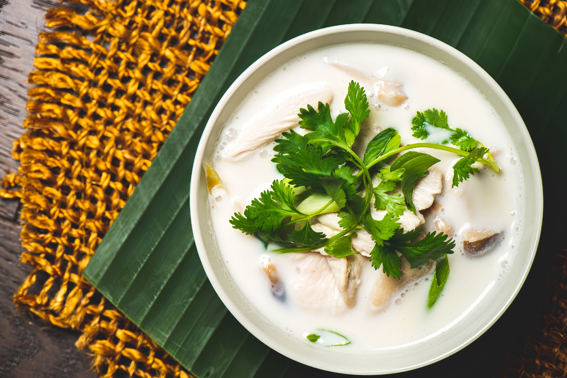 This soup features chicken, straw mushroom caps, lemongrass, spring onions, cilantro and an enticing taste of galangal roots infused with coconut milk