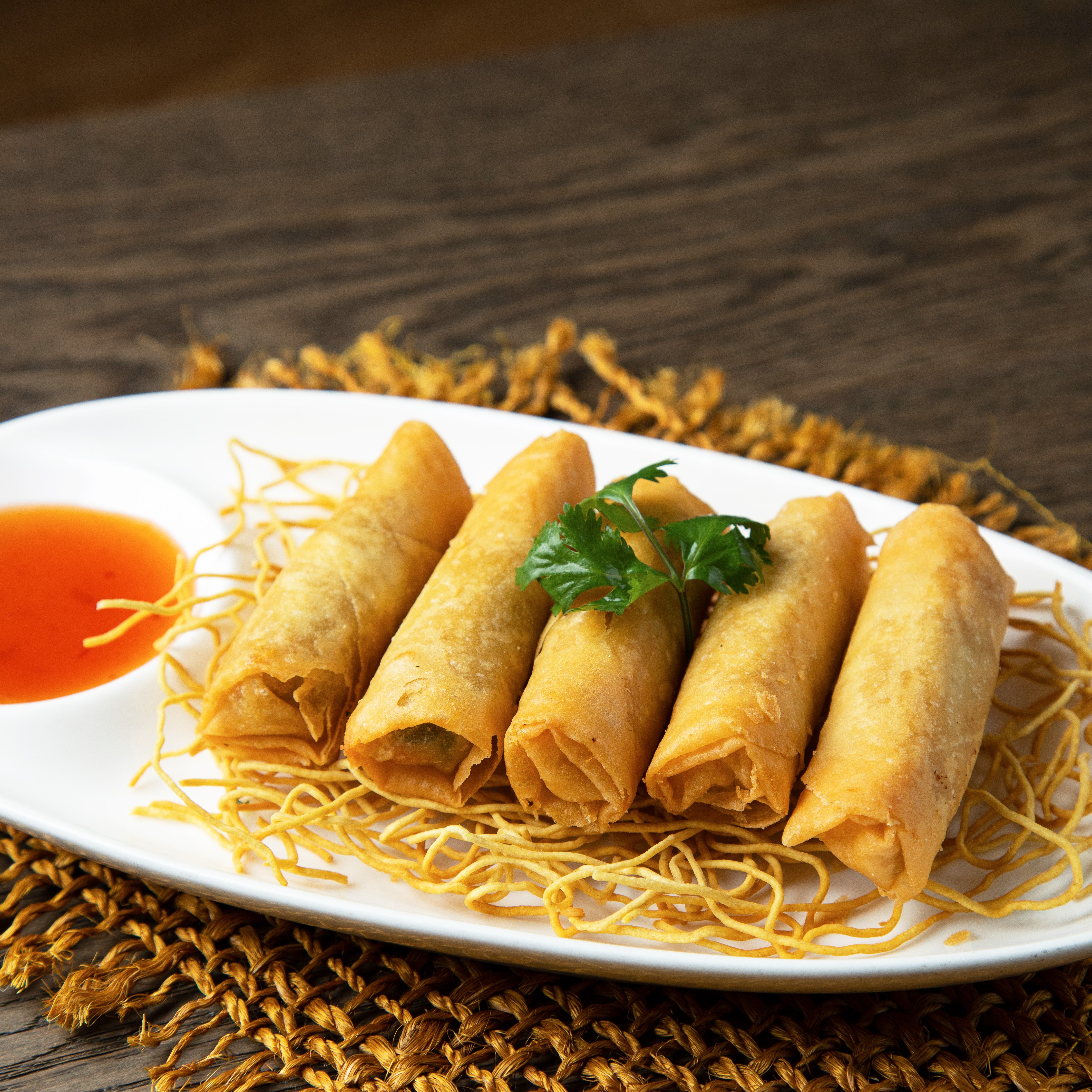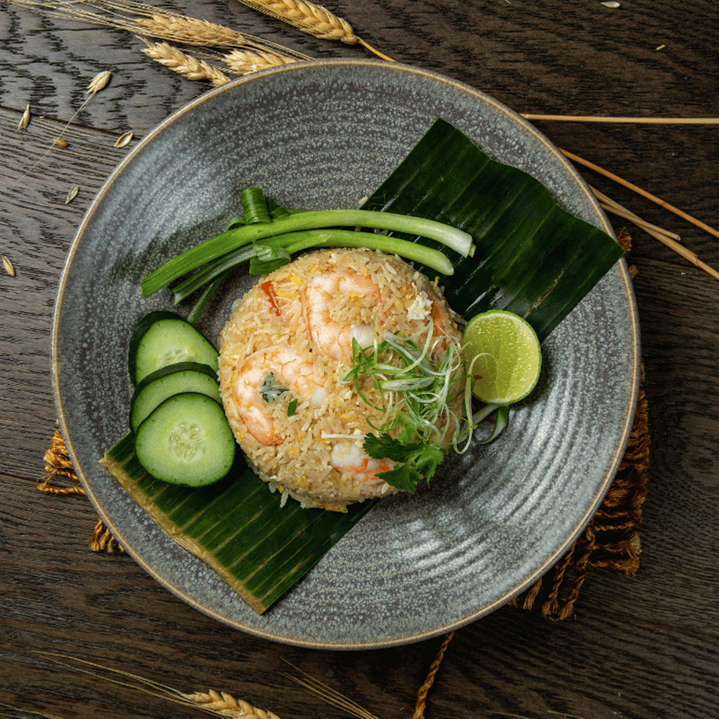 Designed by Bai Tong chefs for a uniquely light Thai taste, these wide rice noodles are stir-fried with egg, and served on a bed of fresh lettuce.