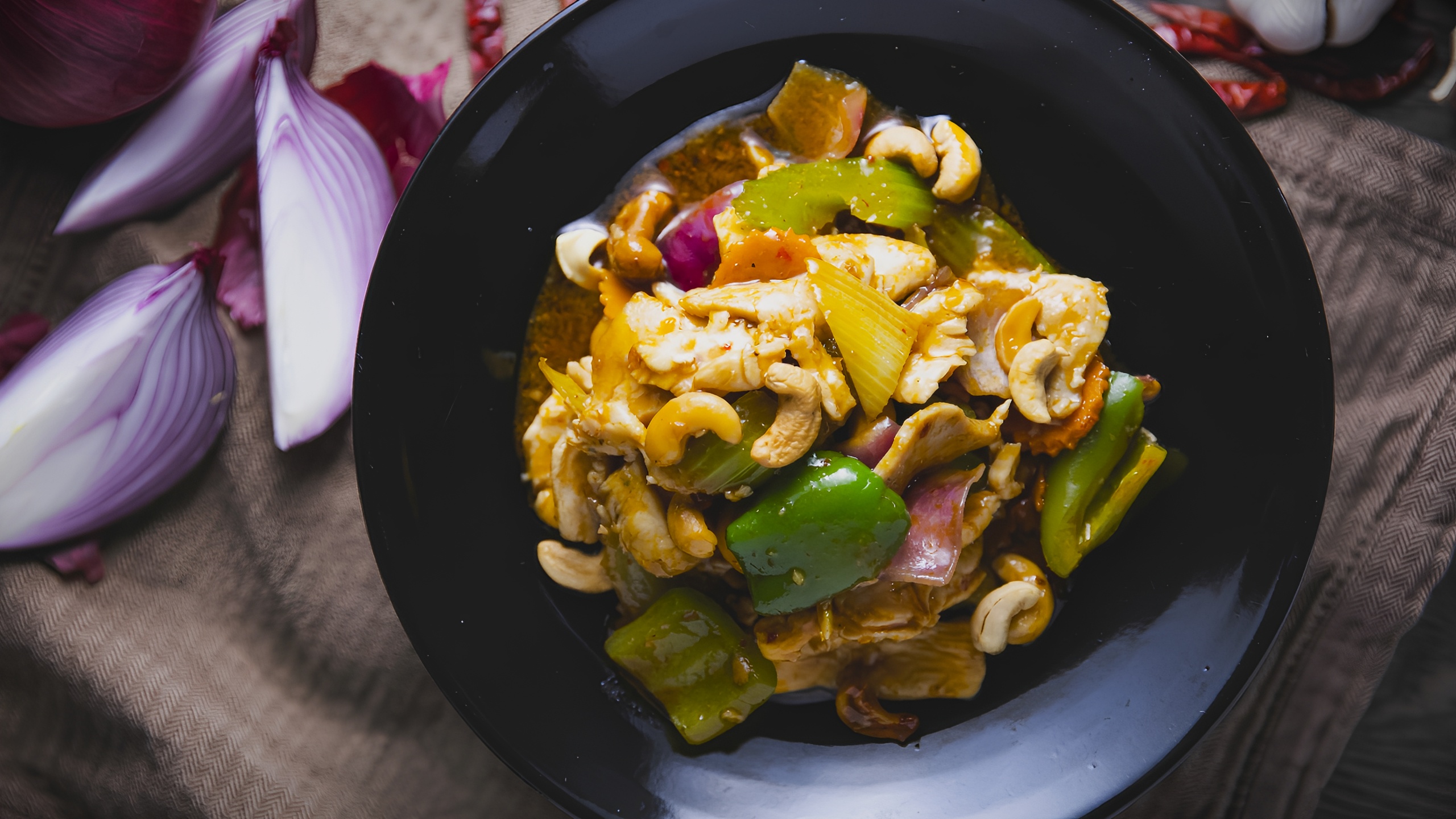 Stir-fried chicken with chili pastes, cashew nuts, red and green bell peppers, onions, carrots, and celery. ** RICE IS NOT INCLUDED WITH THIS DISH **