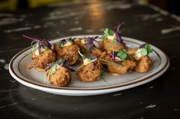 Deep fried Brussels sprouts tossed in a sweet jalapeño truffle dressing and garnished with candied walnuts. (CN)
