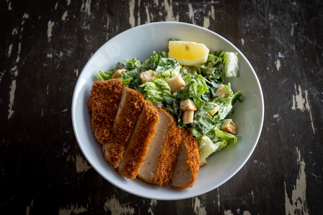 Fried or grilled chicken, romaine lettuce, garlic croutons, parmesan cheese, and Caesar dressing.