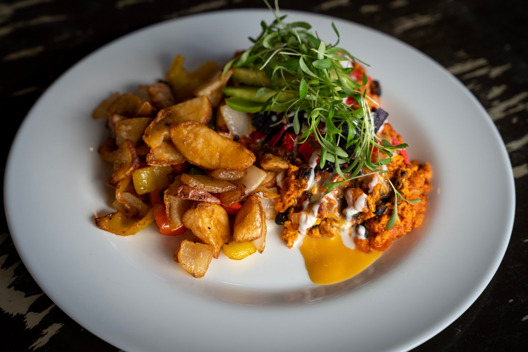 plant based Scrambled eggs, plant based sausage, chorizo, corn tortilla chips, enchilada sauce with black beans, diced tomatoes, diced onions. sour cream. avocado and cilantro topped with plant based cheddar cheese sauce. Served with home fries. (GF)