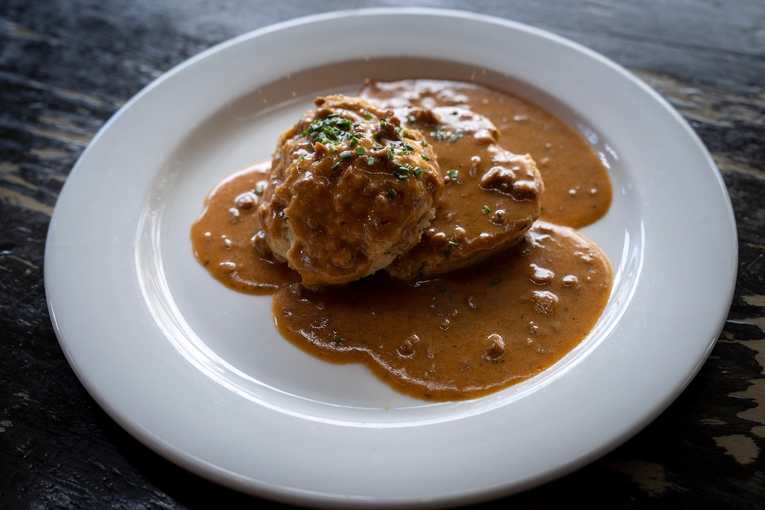A traditional fried breaded steak, dropped on top our breakfast potato, covered with country gravy, served with scrambled eggs and sourdough toast (nut free)