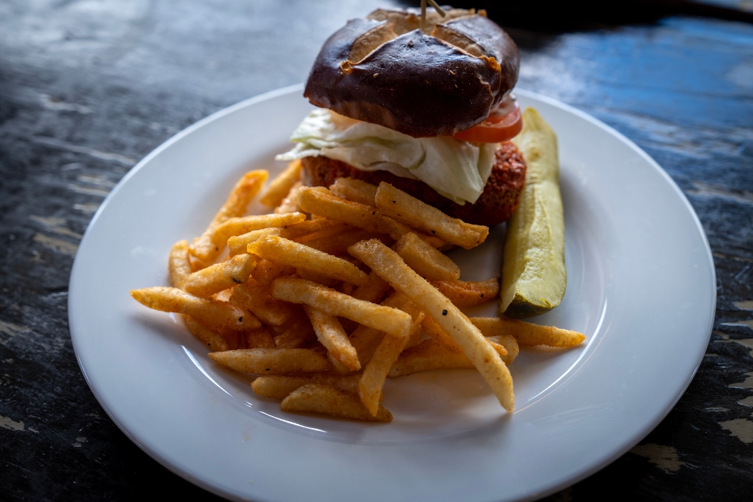 plant based Burger patty, burger l bun, roasted poblano pepper, avocado, tomato, lettuce, plant based pepper jack cheese and plant based sriracha mayo. Served with fries.
