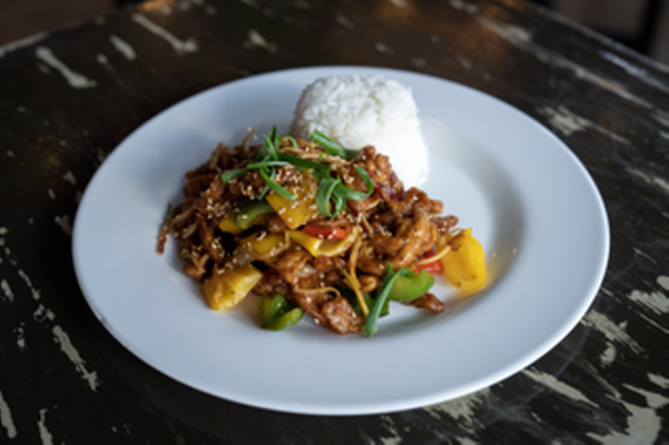 Crispy fried chiggen with peppers and onions on a bed of white rice. Topped with teriyaki sauce, green onions, and sesame seeds. (GF)