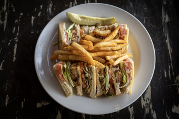 Sourdough bread, tempeh bacon, vegan ham, mayo, lettuce, and tomatoes. Served with fries.