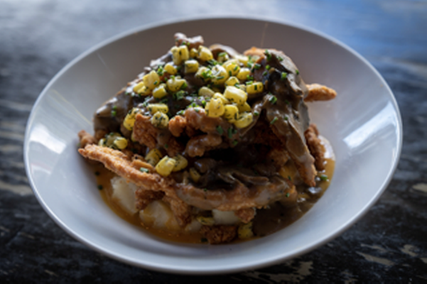 Popcorn chiggen, mashed potatoes, dill seasoned corn, mushroom gravy, and cheddar cheese sauce. (GF)