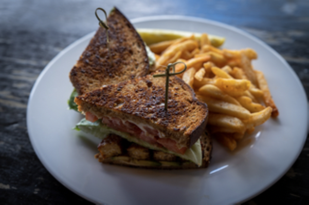 Wheat bread, tempeh bacon, lettuce, tomato, avocado, and mayo. Served with fries.