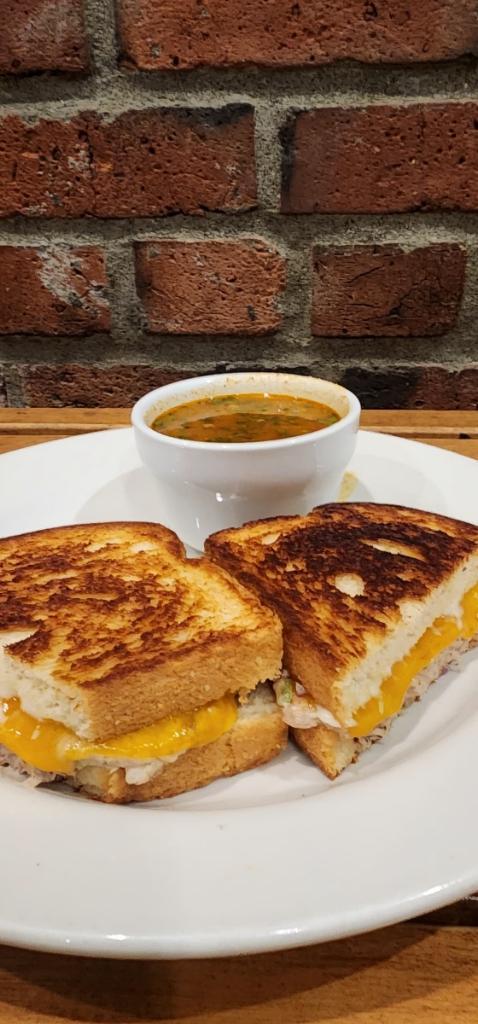 Our classic Tuna Melt features creamy tuna salad and gooey melted cheddar cheese layered between slices of sourdough bread. Enjoy it with the soup of the day or upgrade to clam chowder for an extra $2.