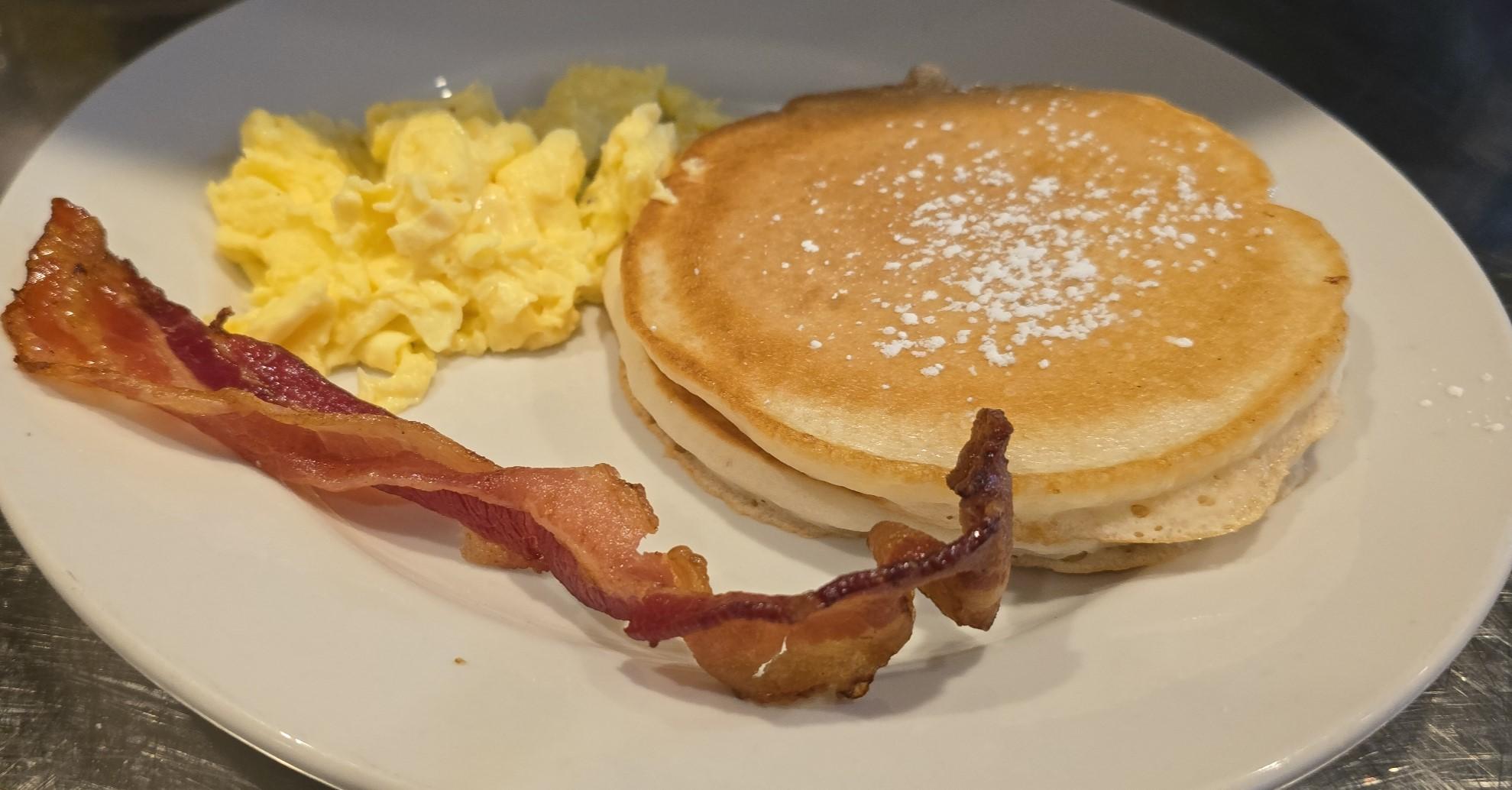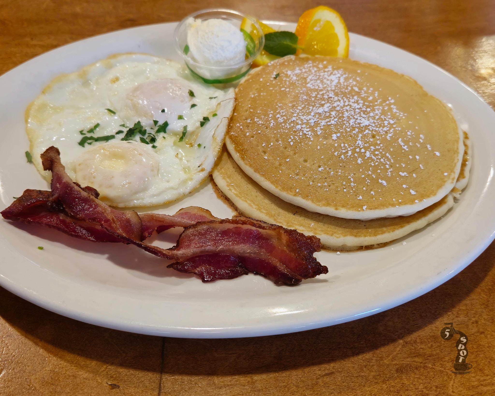 Short stack of fluffy buttermilk pancakes, bacon & two eggs any style.