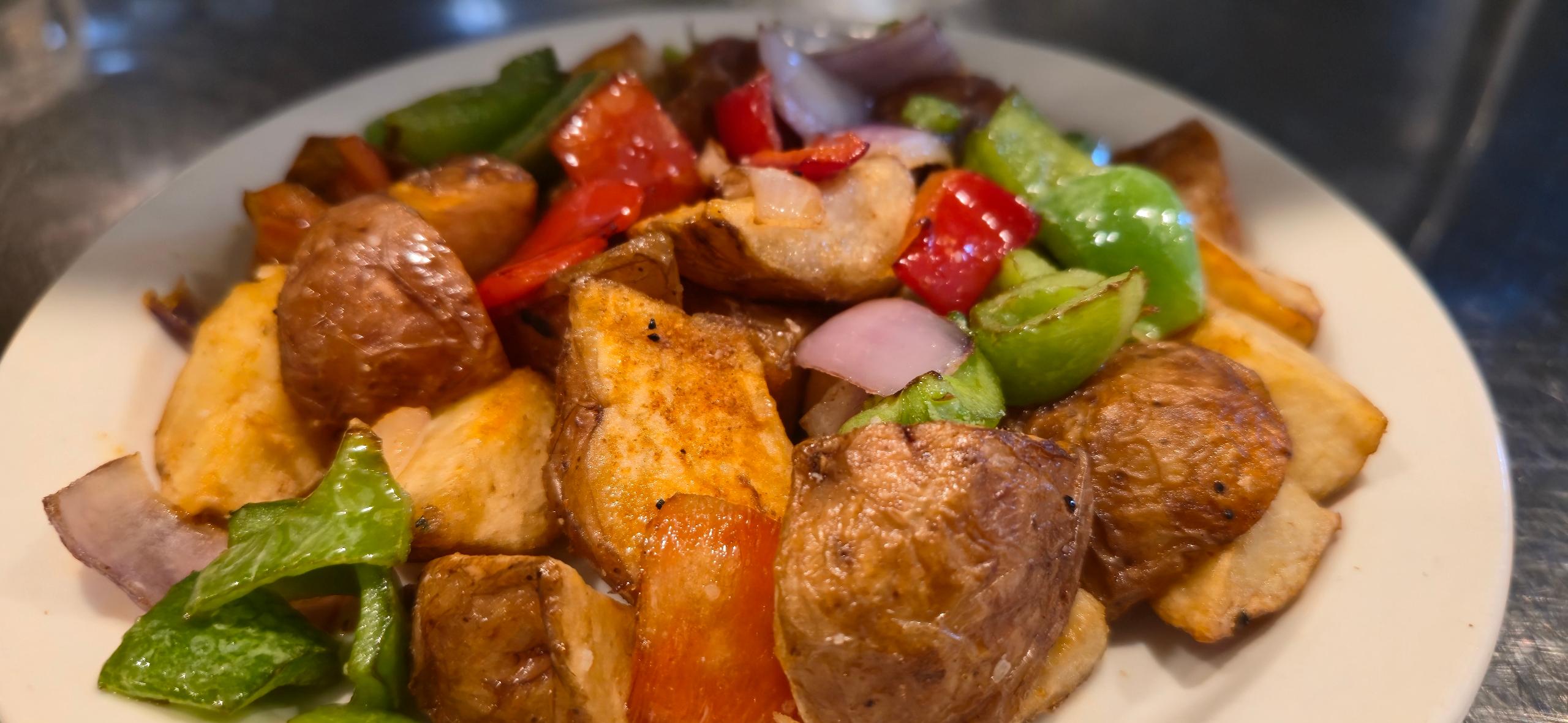Three eggs scrambled in a cast iron skillet with sausage, bacon, spinach, onions & peppers, mushrooms and topped with melted cheese. Served with hash browns or spicy red jacket potatoes, and biscuit or toast.
