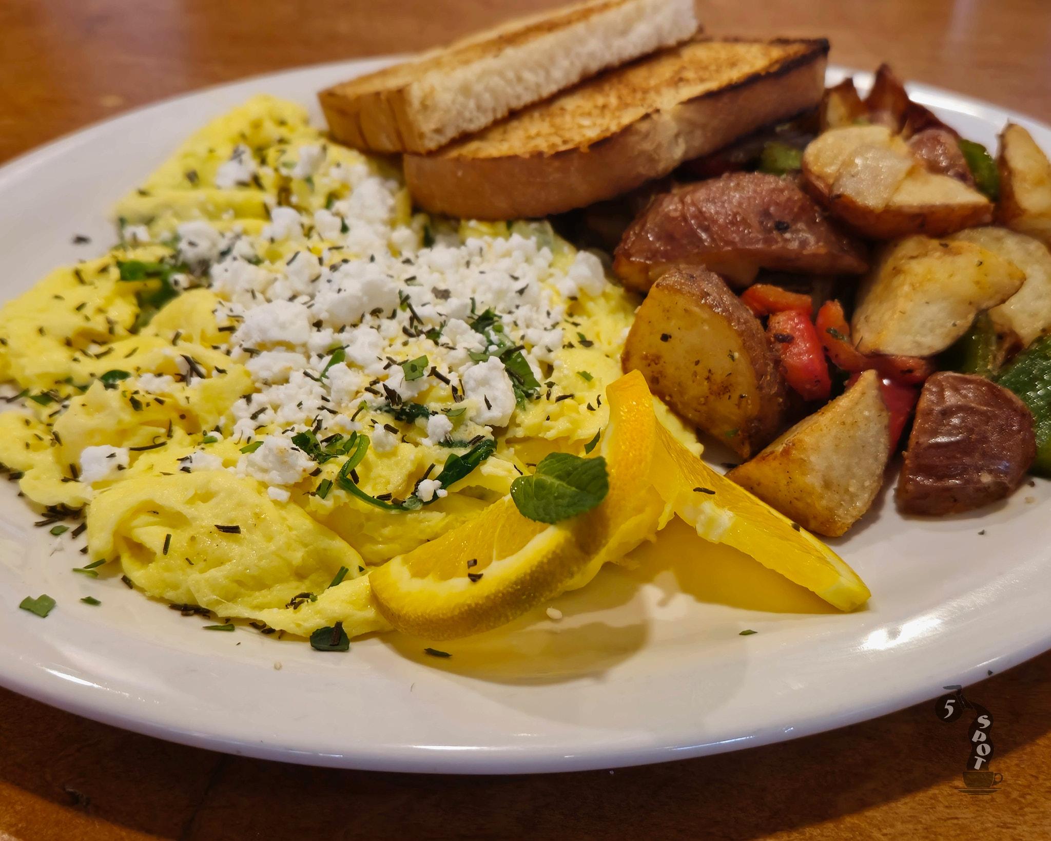 Three scrambled eggs with goat cheese, arugula, and fresh herbs. Served with hash browns or spicy red jacket potatoes, and biscuit or toast.
