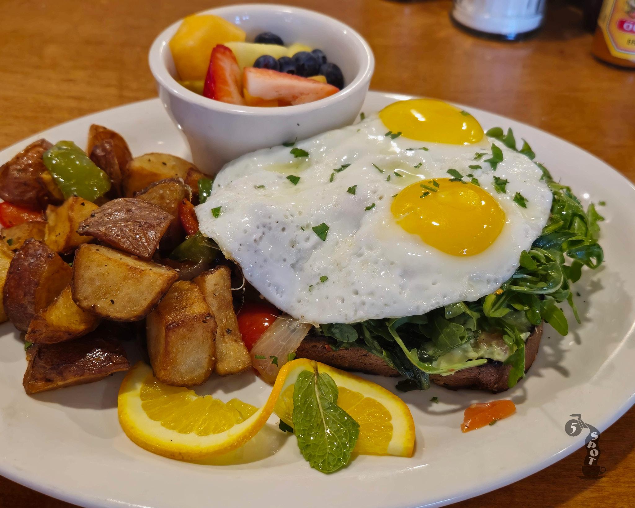 Whole grain toast topped with fresh avocado, arugula, eggs any style, and olive oil. Garnished with chili flakes, salt and pepper, and pico de gallo. Served with hashbrowns or spicy red jacket potatoes and a side of fruit.