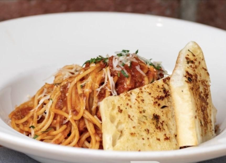 Linguini pasta topped with rich meaty Bolognese sauce & freshly shaved parmesan cheese. Served with 5 Spot garlic bread.