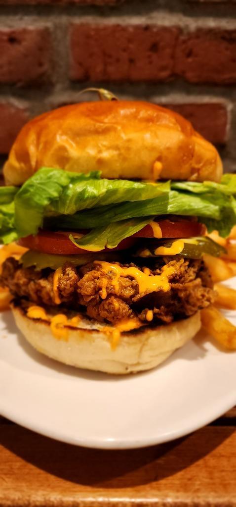 Crispy fried chicken with lettuce, tomato, and pickles. Served on a burger bun with Sriracha aioli.