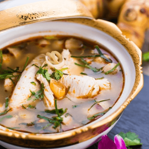 (Spice Level: Mild) Our famous spicy and sour soup is served simmering with chicken, straw mushroom caps, lemongrass, galangal root, spring onions and cilantro.