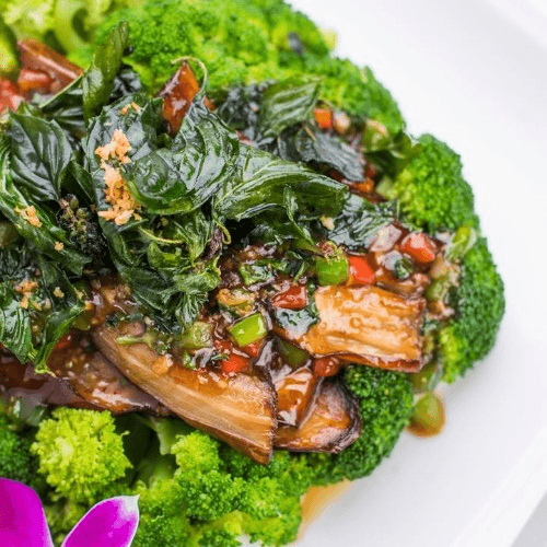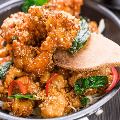 Our house specialty. Lightly battered and fried boneless chicken pieces, stir-fried in a sweet, garlic-infused sauce topped with crispy fried basil leaves and red bell peppers.