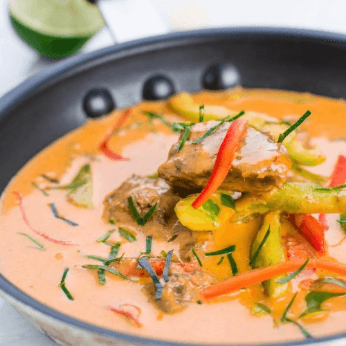A mild southern-style curry of slowly simmered lamb rack, potatoes, peanuts and red onions cooked in massaman curry. This dish has peanuts as its main ingredient.