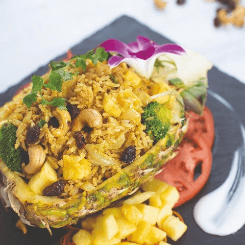 Jasmine rice infused with yellow curry flavor stir fried with pineapple, cashew nuts, tofu, raisins and onions.