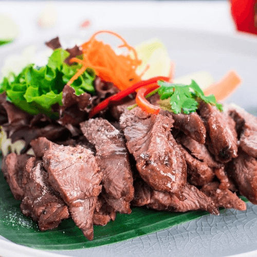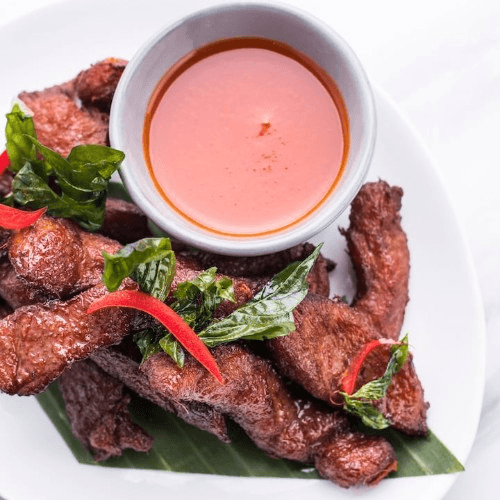 Tender flat iron beef steak grilled to perfection served with Thai style dipping sauce infused with roasted ground rice and served with fresh vegetables.