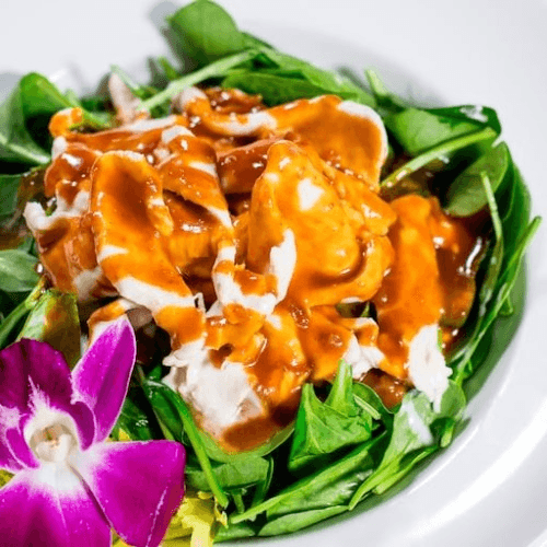 Sliced tender chicken breast served with fresh spinach drizzled with our famous homemade peanut sauce.