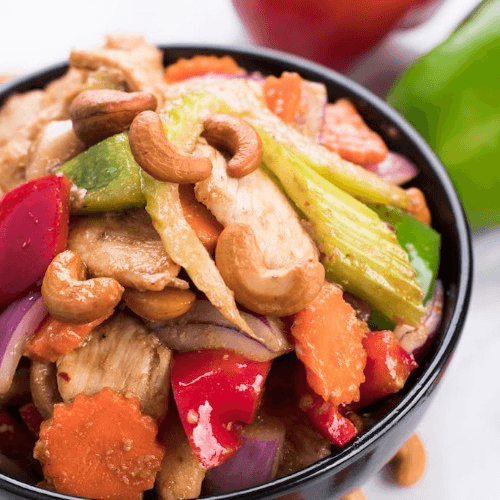Tender chicken breast stir fried in our famous cashew nut sauce with red and green bell peppers, celery, carrots, red onions and cashew nuts.