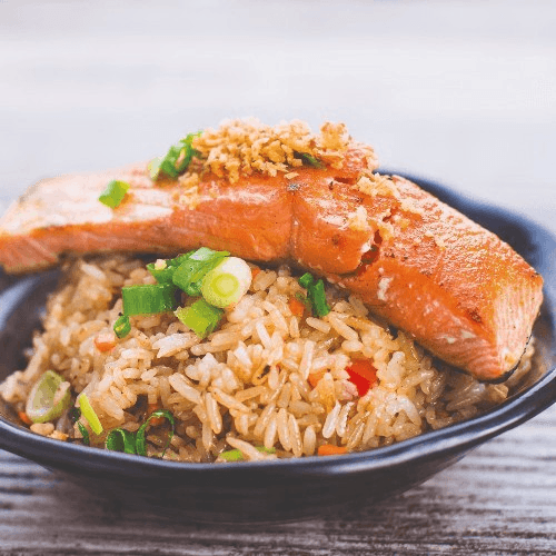 Jasmine rice stir-fried in flavorful garlic paste, red bell pepper, carrot and green onions. Topped with grilled garlic butter salmon fillet.