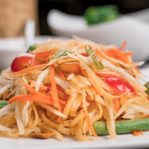 Papaya Thai salad featuring shredded papaya, tomatoes, carrots, green beans, fresh chilies, lime juice, dried shrimp and crushed peanuts.