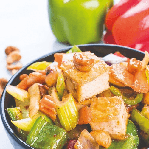Fried tofu and cashew nuts stir-fried in our famous cashew nut sauce with red and green bell peppers, celery, carrots and red onions.