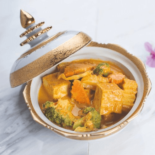 Succulent Alaskan crab meat cooked with coconut milk and betel leaves simmered in a aromatic yellow curry.