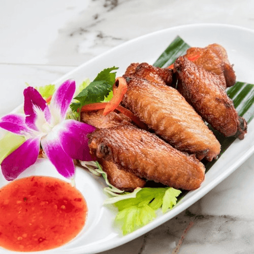 Our tasty wings are marinated in garlic and soy sauce, then fried. Served with a sweet chili dipping sauce