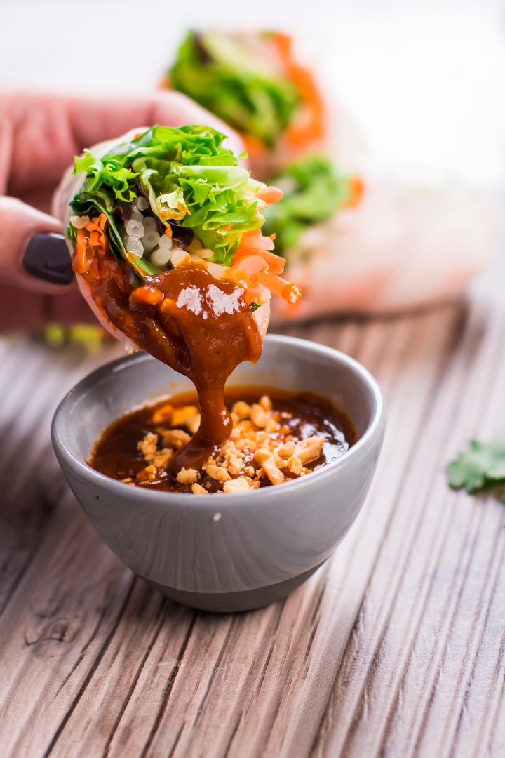 Stuffed with tofu, cilantro, sprouts, carrots, lettuce, basil leaves and rice vermicelli wrapped in soft rice skin served with our famous peanut sauce.
