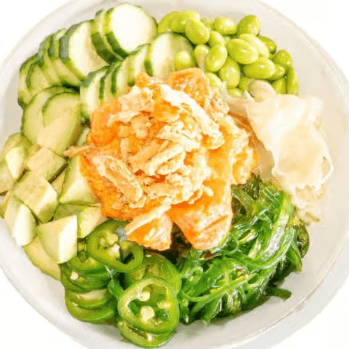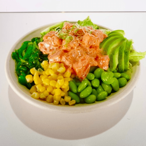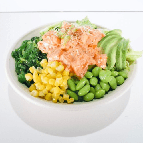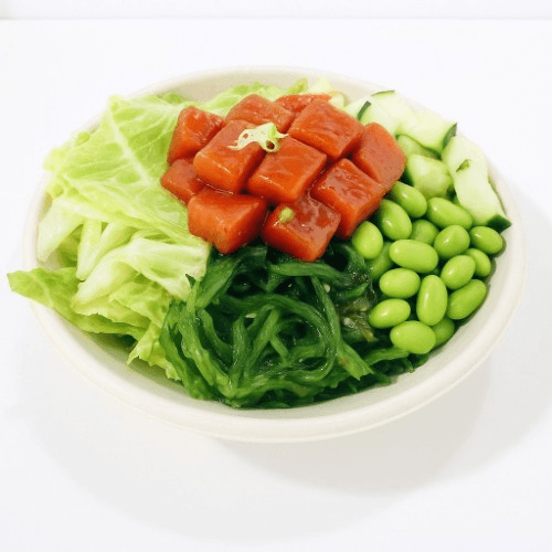 Raw fish. Poke salmon, cucumber, green lettuce, avocado, seaweed salad, edamame, corn. Eating raw fish may increase your risk of foodborne illness.