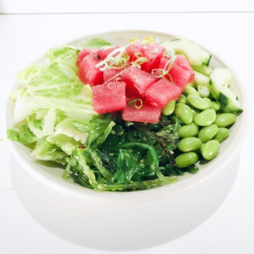 Raw fish. Poké tuna, cucumber, green lettuce, avocado, seaweed salad, edamame, corn. Eating raw fish may increase your risk of foodborne illness.