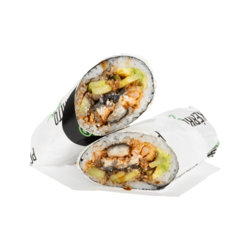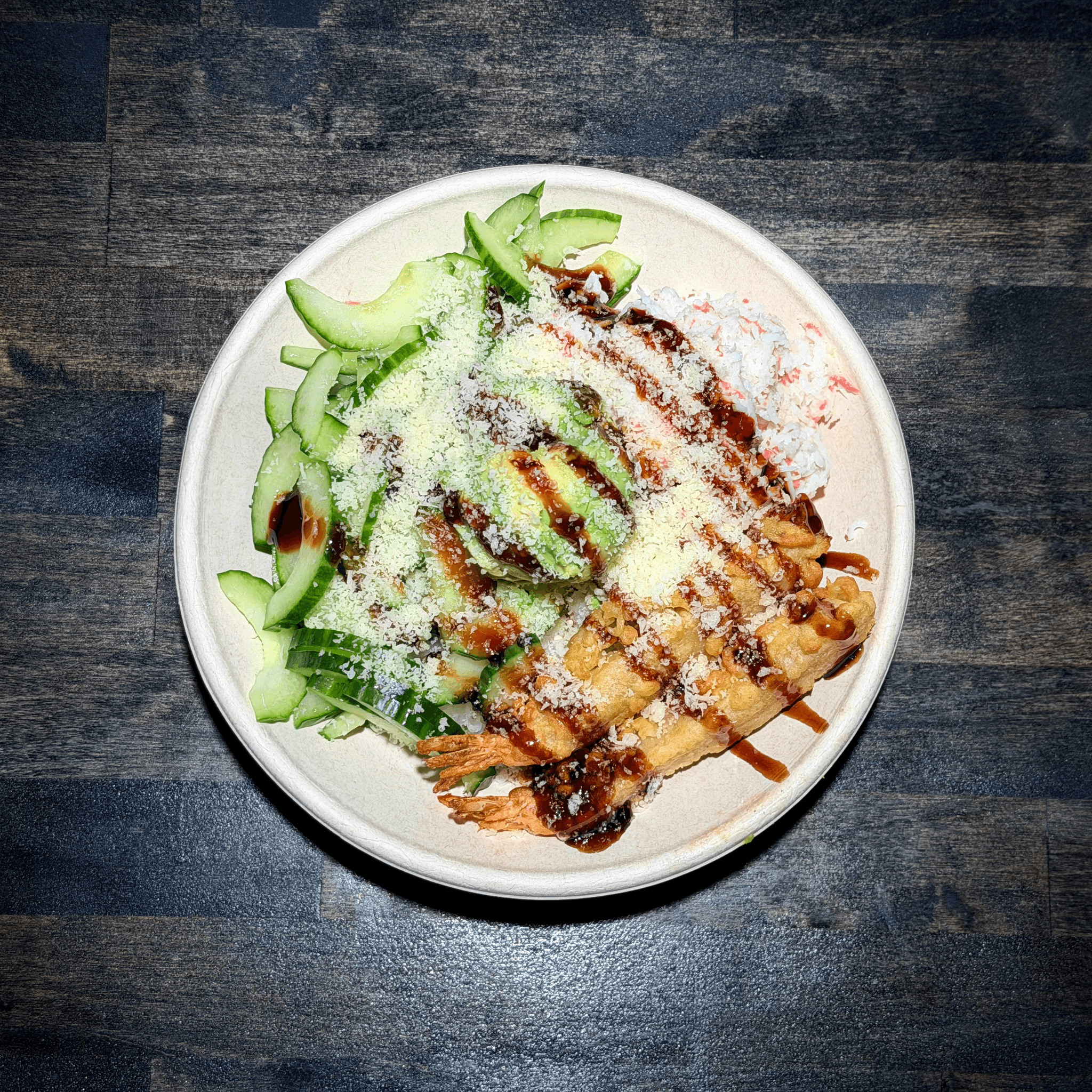Broiled eel, tempura shrimp, avocado, cucumber, crispy onion, furikake, eel sauce.