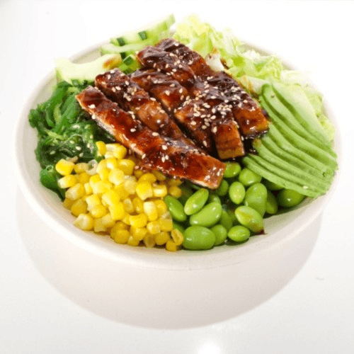 Chicken Karaage , cucumber, green lettuce, avocado, seaweed salad, edamame, corn Eating raw fish may increase your risk of foodborne illness.