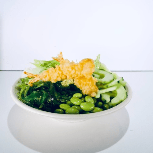 Tempura shrimp, cucumber, green lettuce, avocado, seaweed salad, edamame, corn.