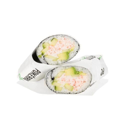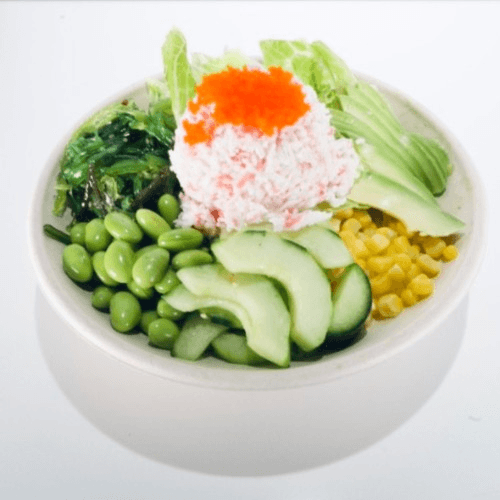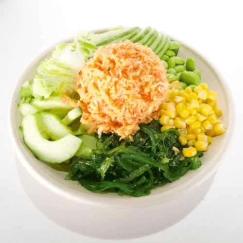 Surimi crab, cucumber, green lettuce, avocado, seaweed salad, edamame, corn.
