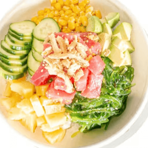 Raw fish. Poke tuna, cucumber, avocado, seaweed salad, corn, pineapple, sesame seed, crispy onion. Eating raw fish may increase your risk of foodborne illness.