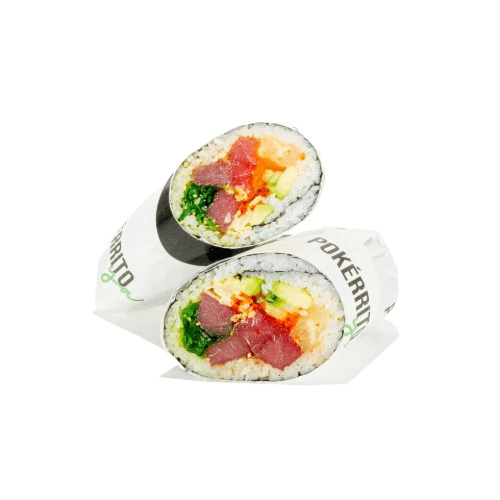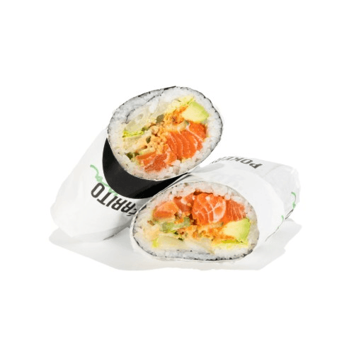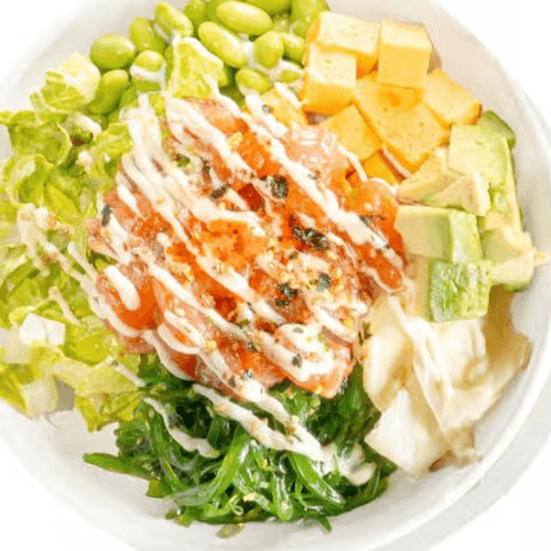 Raw fish. Poke salmon, avocado, masago, cucumber, lettuce, crispy onion, spicy mayo. Eating raw fish may increase your risk of foodborne illness.