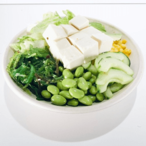 Poké tofu, cucumber, green lettuce, avocado, seaweed salad, edamame, corn.