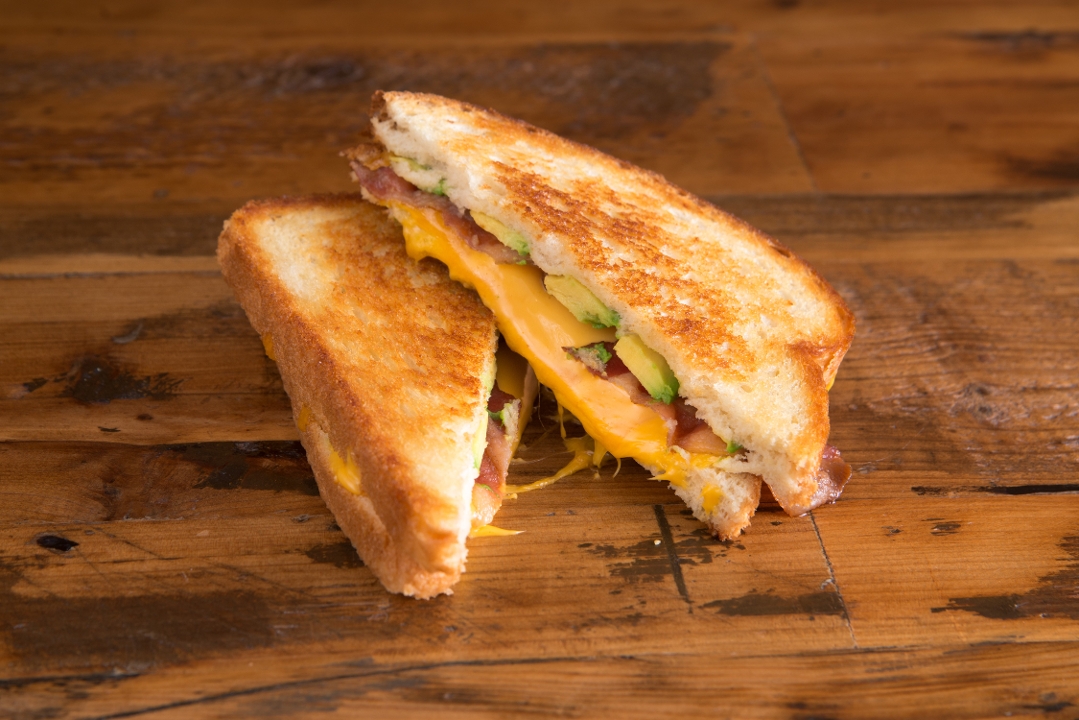 Combination of 2 american cheese and 2 tillamook cheddar cheese, fresh avocado, 2 strips of bacon on sourdough bread.