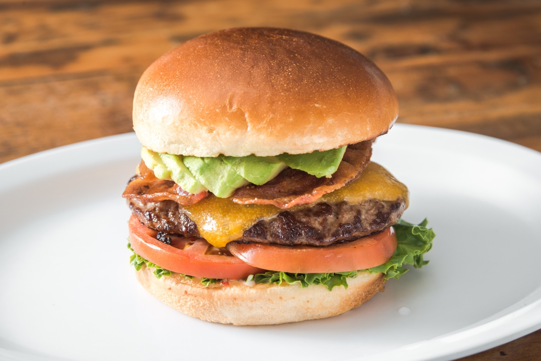 1/4 lb. of fresh Angus beef patty, fresh avocado, 2 strips of bacon, cheddar cheese, lettuce, tomato, pickle and house Sauce on a brioche Bun.