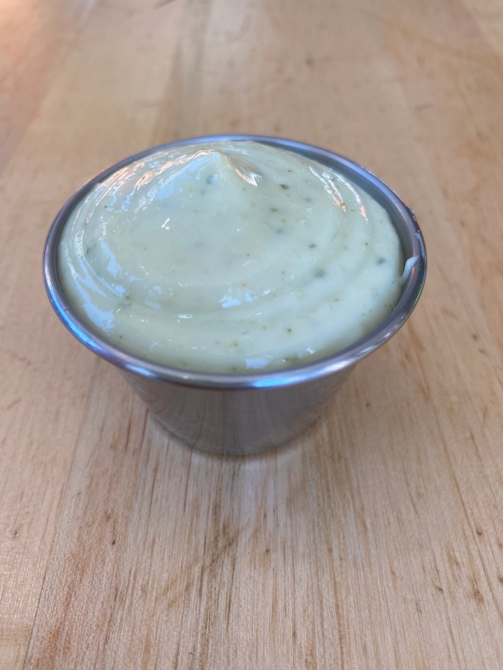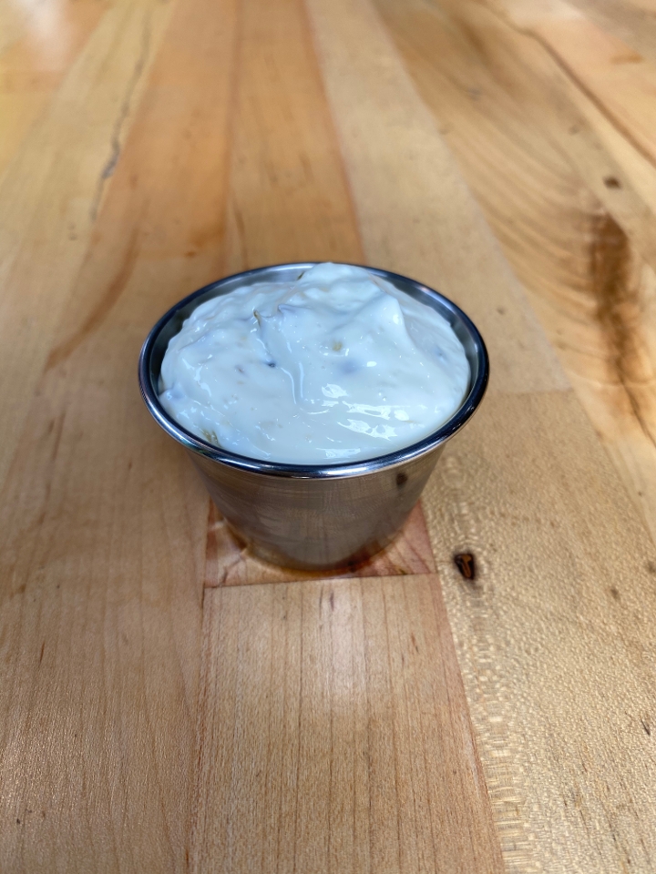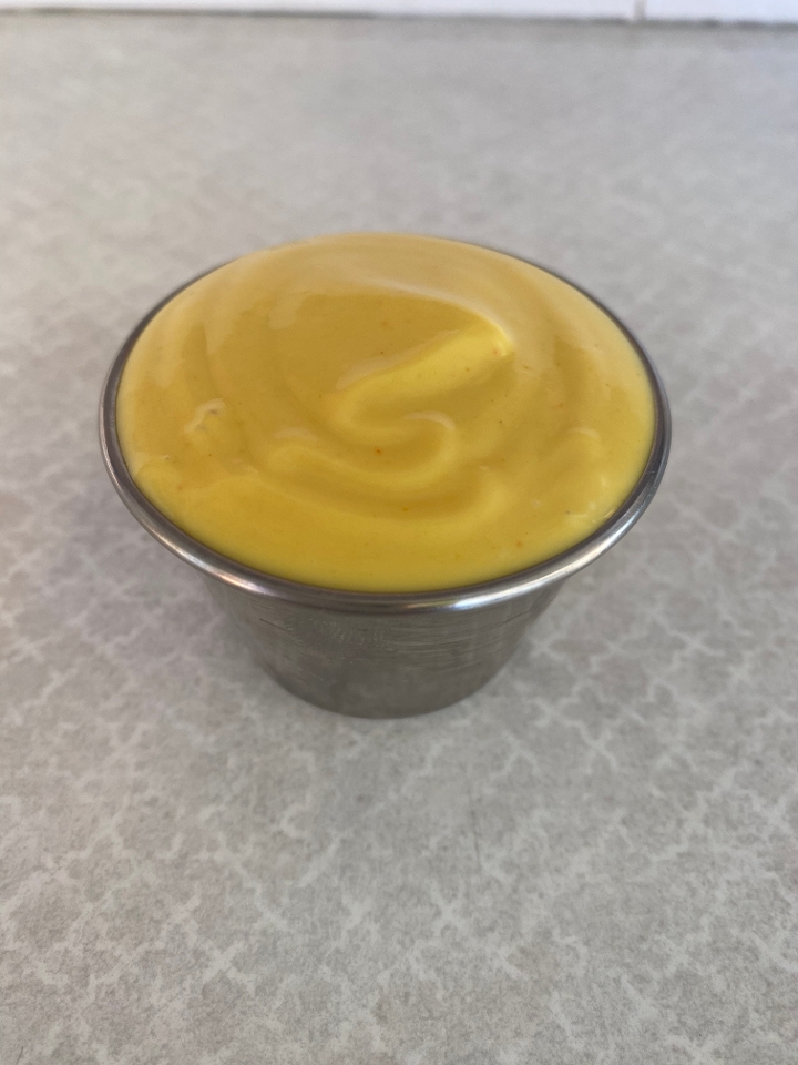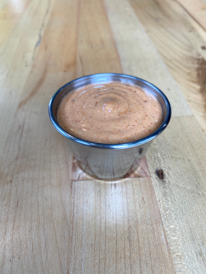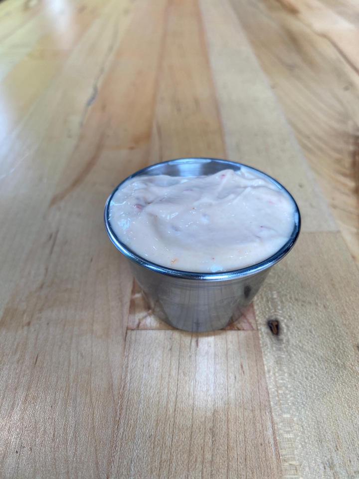 Fried egg, 2 strips of bacon, american cheese, cream cheese w/ house sauce on a brioche bun.