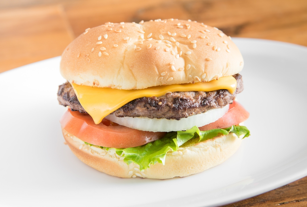1/4 lb. of fresh Angus beef patty, Lettuce, Tomato, Onion, Pickle and house Sauce on a Sesame Bun. No Cheese!