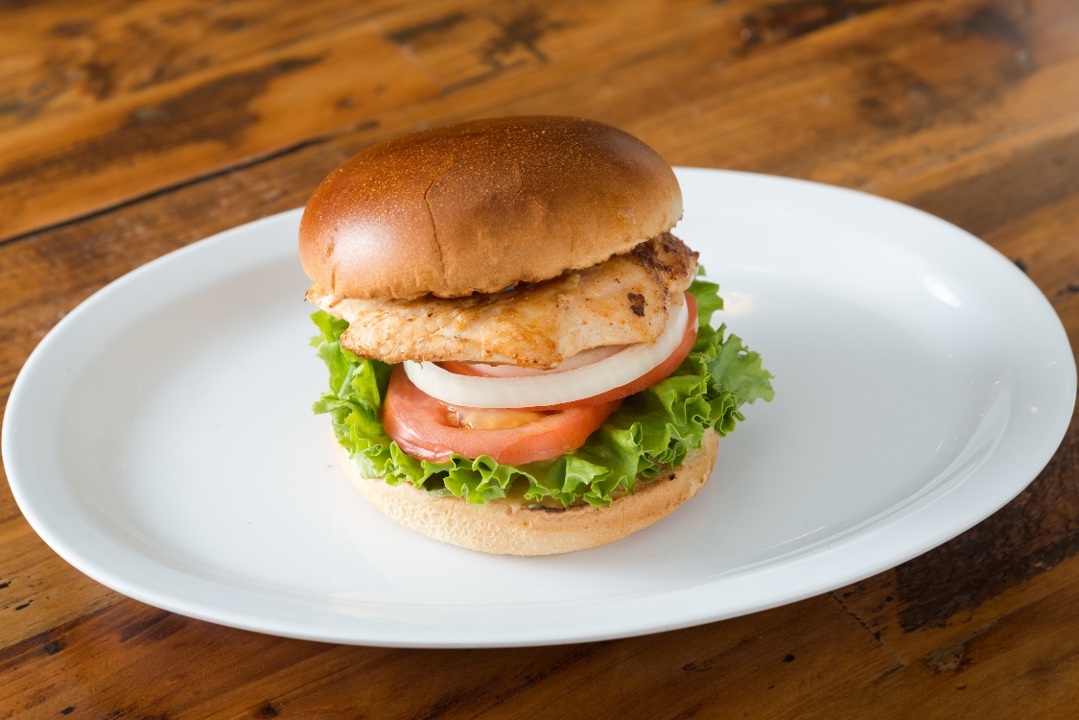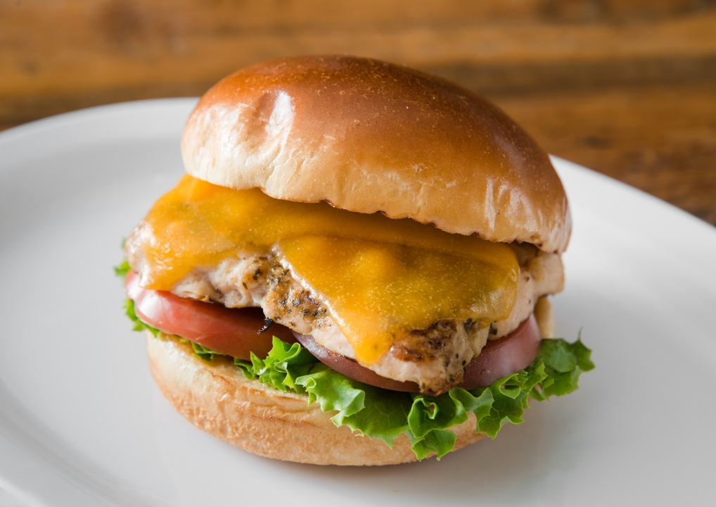 5 oz of grilled chicken breast, lettuce, tomatoes, onions, pickles with house sauce on a brioche bun. ( NO CHEESE)