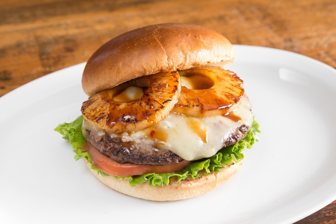 1/4 lb. of fresh Angus beef patty, 2 slices of grilled pineapple, pepper jack cheese, lettuce, tomato, onion, pickle and house Sauce on a Sesame Bun.