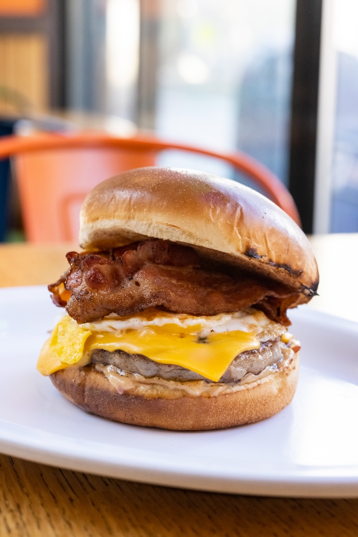 sausage patty, fried egg, 2 strips of bacon and american cheese with house sauce on brioche bun.