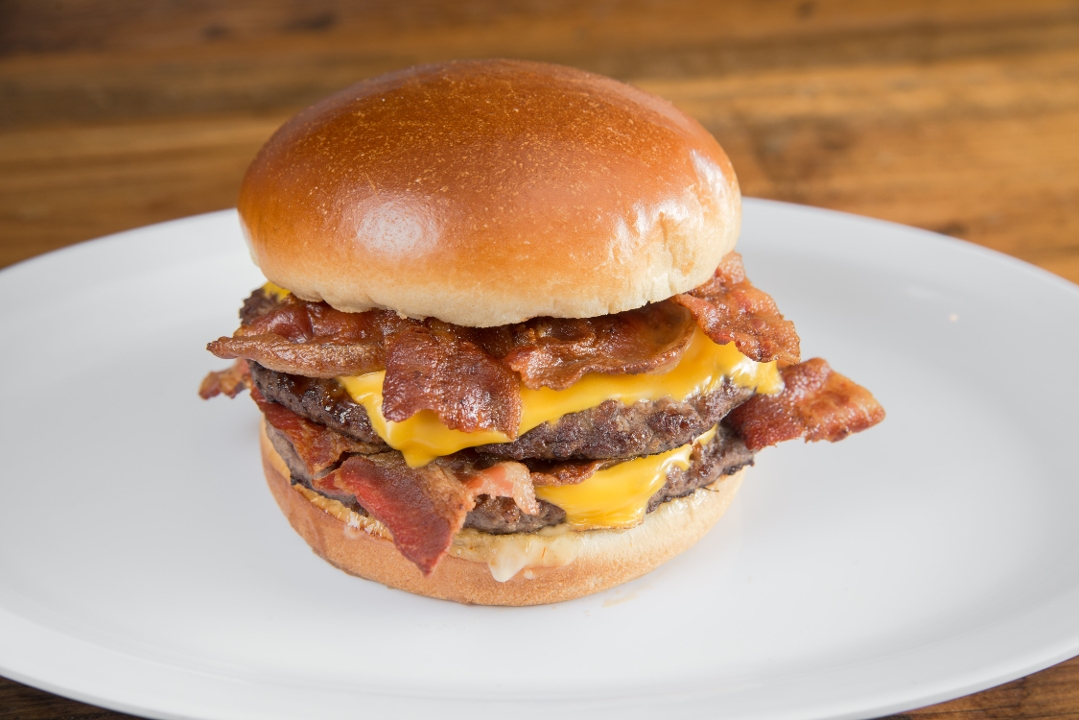 Two, 1/4 lb. of fresh Angus beef Patties, 2 american cheese, 4 strips of bacon w/ house sauce on a brioche bun. ( no Veggies on this burger)