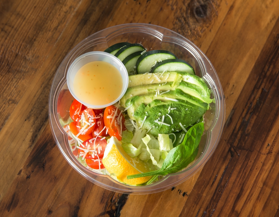 Chopped romaine lettuce, spinach, fresh avocado, bacon, english cucumber, grape tomatoes, onions, parmesan cheese, with your choice of dressing. (ranch, blue cheese, balsamic vinaigrette and italian)